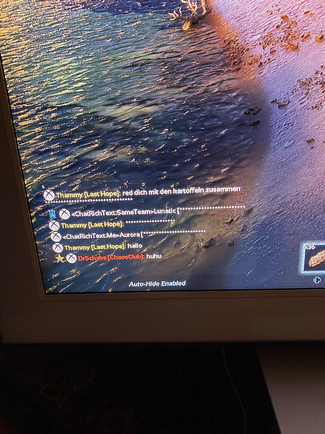 2. Huhu, gibt es hier noch mehr Xbox Spieler? Ich sehe den Chat nicht richtig und habe alle möglichen Einstellungen ausprobiert. Liegt es an meinen Einstellungen oder an den Servereinstellungen? Schreibe fast nie im Chat, da ich nur die Hälfte sehe.. auf dem Bild (angefügt) sieht man was ich meine. Hälfte der Texte sind durchgesternt