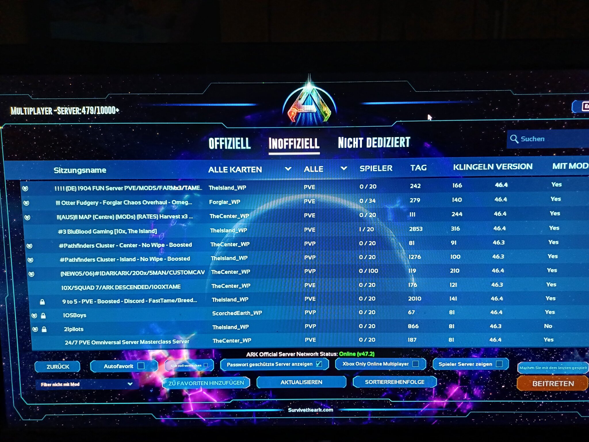 Hallo liebe Runde, leider finde ich unseren Server bei ASA nicht mehr. Wenn ich die Karte "Beitreten" öffne sehe ich viele Server, aber wenn ich den Namen eingebe verschwinden alle. ich habe alles mögliche ausprobiert, jedoch erfolglos. Ich spiele vom PC die X-Boxversion. Bis einer aus unserer Runde feststellte, daß bei mir Version die falsche steht (46,4) bzw (46,3). Aber unten unter der Tabelle steht: ARK Official Server Network Status Online (v47.2) . was kann ich tun, daß es wieder funktioniert? Vielen Dank schon mal im voraus